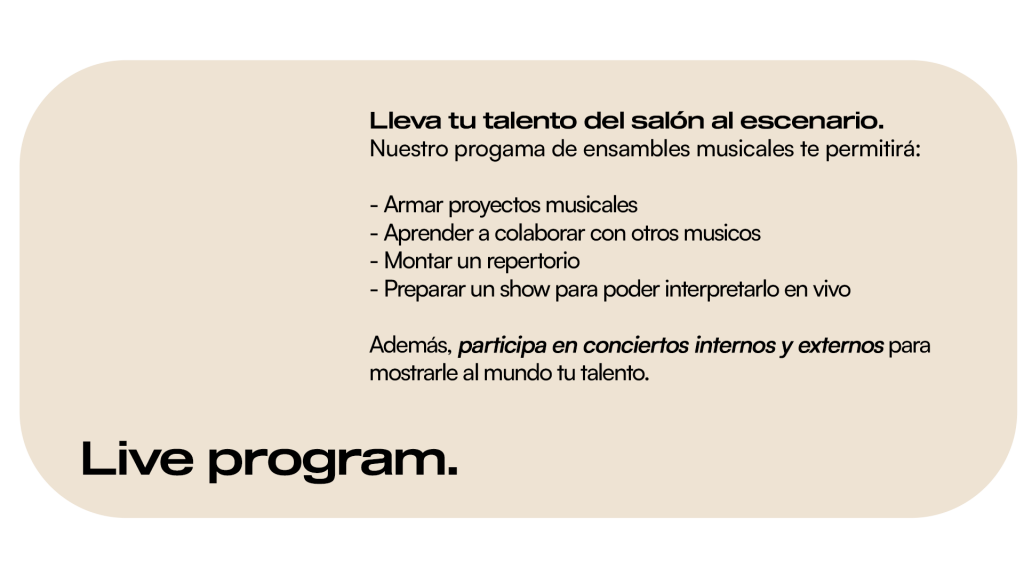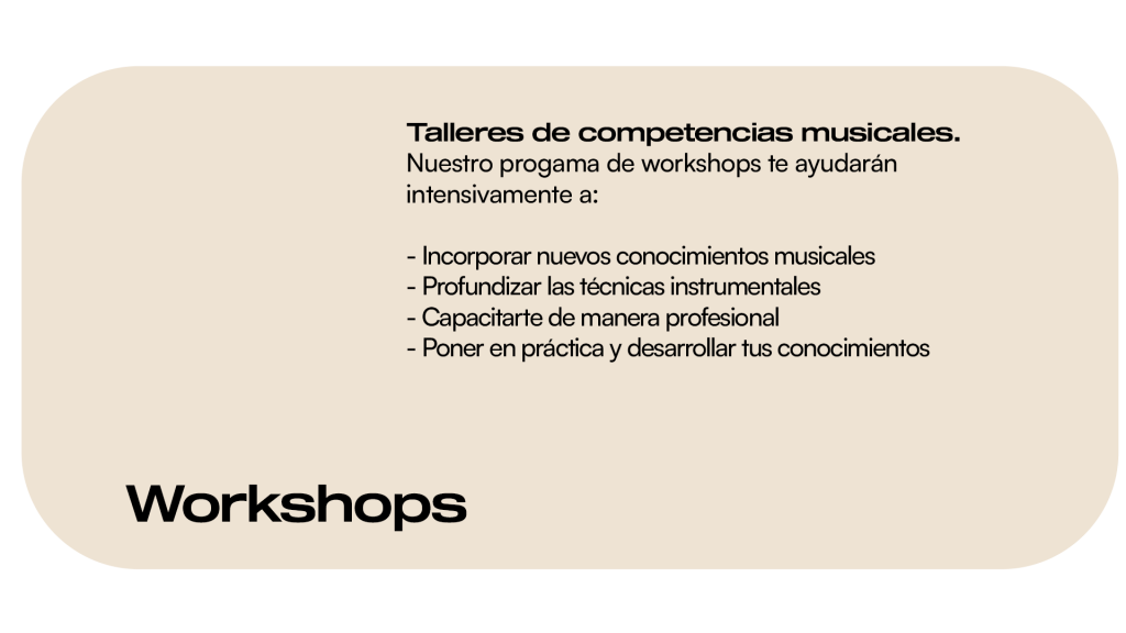 CLASES DE MÚSICA Y TALLERES ESPECIALIZADOS. Desarrolla tus competencias artísticas y profesionales con nuestras clases de música y talleres (Workshops), que abordan temas como: